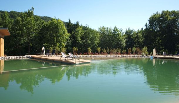 Ein reichhaltiges Kosmetik- sowie Massageangebot runden das Angebot ab. Die Wellness Oase bietet einen direkten Indooreinstieg in den Außen-Schwimmteich. Aus chinesischem Holz gebaut, unter asiatischem Einfluss und in Natur belassener Umgebung, gibt es kaum einen erholsameren Ort. Eine Atmosphäre zum Wohlfühlen, umgeben von wunderschöner Natur und unzähligen Bergen.