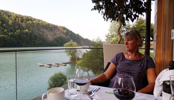Eine herrliche Terrasse umgibt das Restaurant und reicht bis zum Pool. In aller Ruhe frühstücken, den See und die herrliche Natur im Blick und dabei planen was sie an diesem schönen Sonnentag alles unternehmen wollen.
